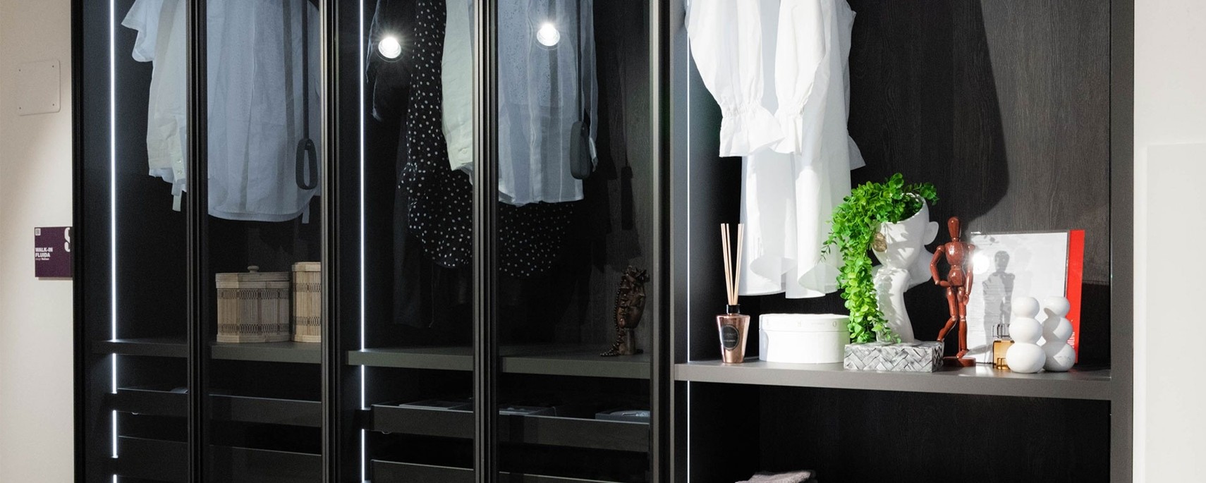 Walk-in Fluida è il sistema Scavolini per creare una cabina armadio versatile e su misura in camera da letto. Puoi configurarla a vista o chiuderla con ante a battente, scorrevoli o con gola, mantenendo sempre un’estetica curata. Gli interni sono personalizzabili con ripiani, tubi appendiabiti, cassettiere e mensole dedicate. Per i cassetti sono disponibili scorrimenti con rallentamento morbido e aperture senza maniglia, così ogni gesto è fluido.