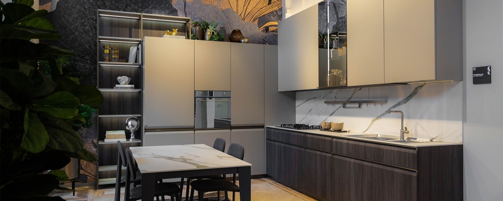 Formalia è perfetta in città come a Roma dove gli spazi possono essere ridotti: una composizione lineare può sfruttare ogni centimetro, mentre in un open space puoi passare a una cucina componibile con isola o penisola, integrando il Living per continuità estetica.
